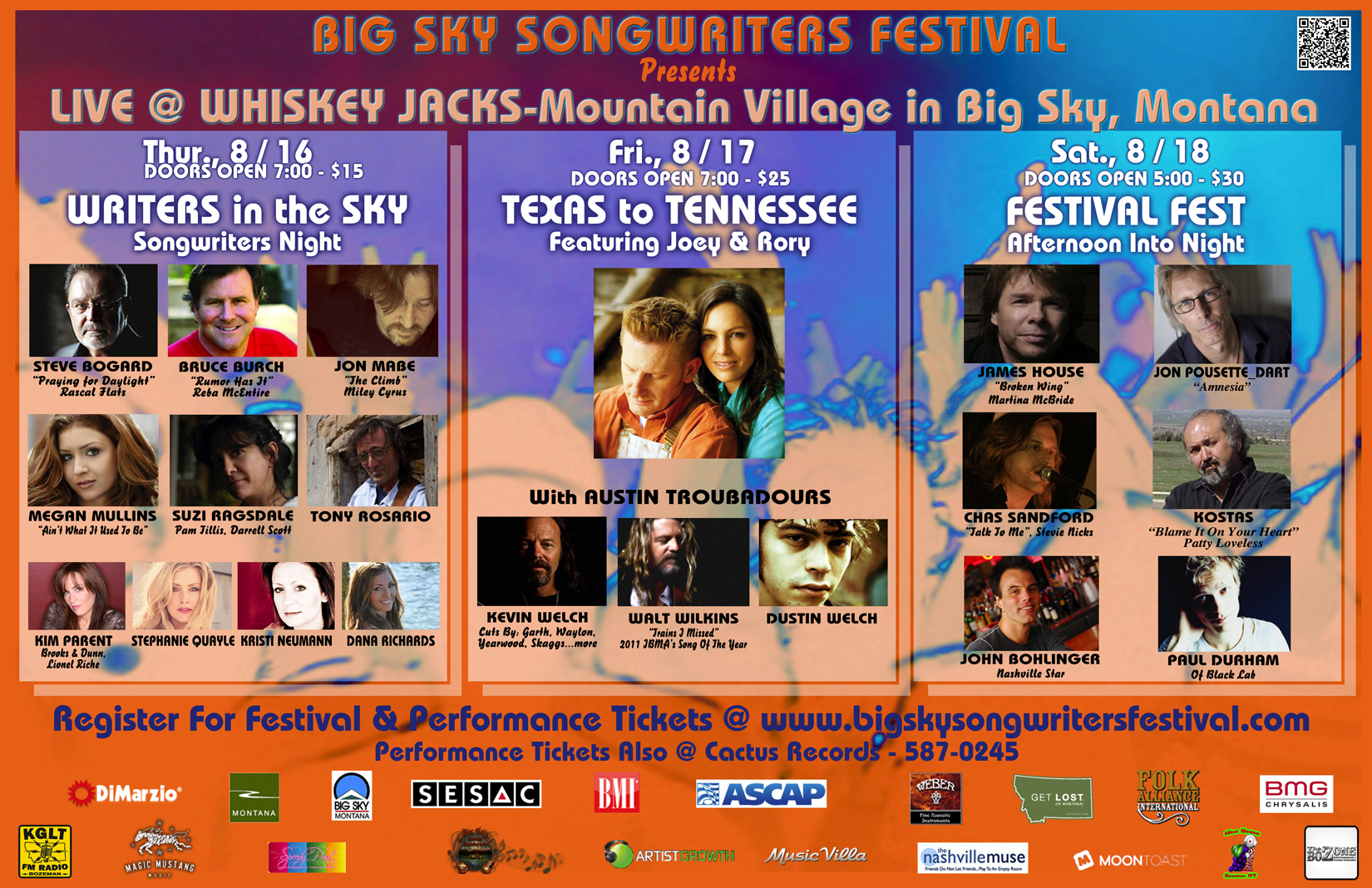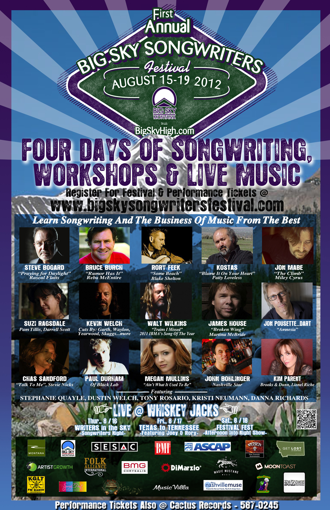 - August 15-19, 2012. Big Sky, MT. 1st Annual Big Sky Songwriters Festival. ATTENTION SERIOUS SONGWRITERS!! NSAI, BMI, ASCAP, SESAC, Rory Feek, Kostas and many other songwriters will be there for workshops, panels, Writers in the Round, etc. If you want to become a better songwriter, you just gotta be there. Room discounts, too! Check it out at www.bigskysongwritersfestival.com. Info Poster Writers in the Sky
